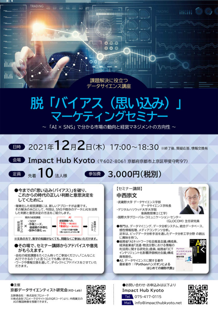 お知らせ 2021年12月2日『脱「バイアス(思い込み)マーケティングセミナー』のご案内 Tweet Pocket 2021.12.01 by jPC 0 2021年12月2日 京都データサイエンティスト研究会主催によるセミナーが開催されます。 日時 2021年12月2日(木) 17:00~18:30※終了後、質疑応答・情報交換があります 定員:10法人様 場所 Impact Hub Kyoto 〒602-8061京都府京都市上京区甲斐守町97